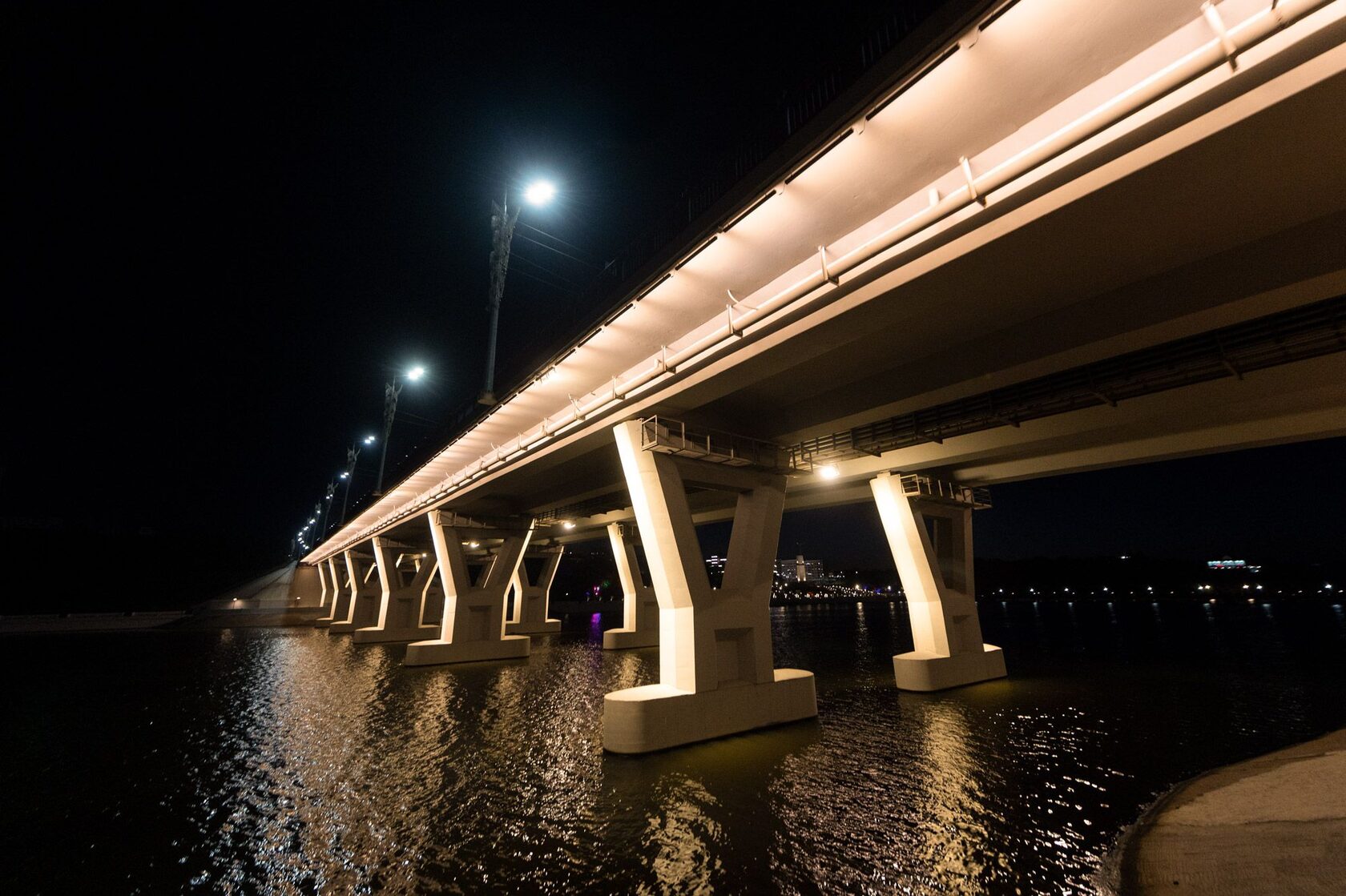 Балочные мосты: Подсветка опор и контурное освещение перил, которое подчеркивает протяженность и ритм сооружения.