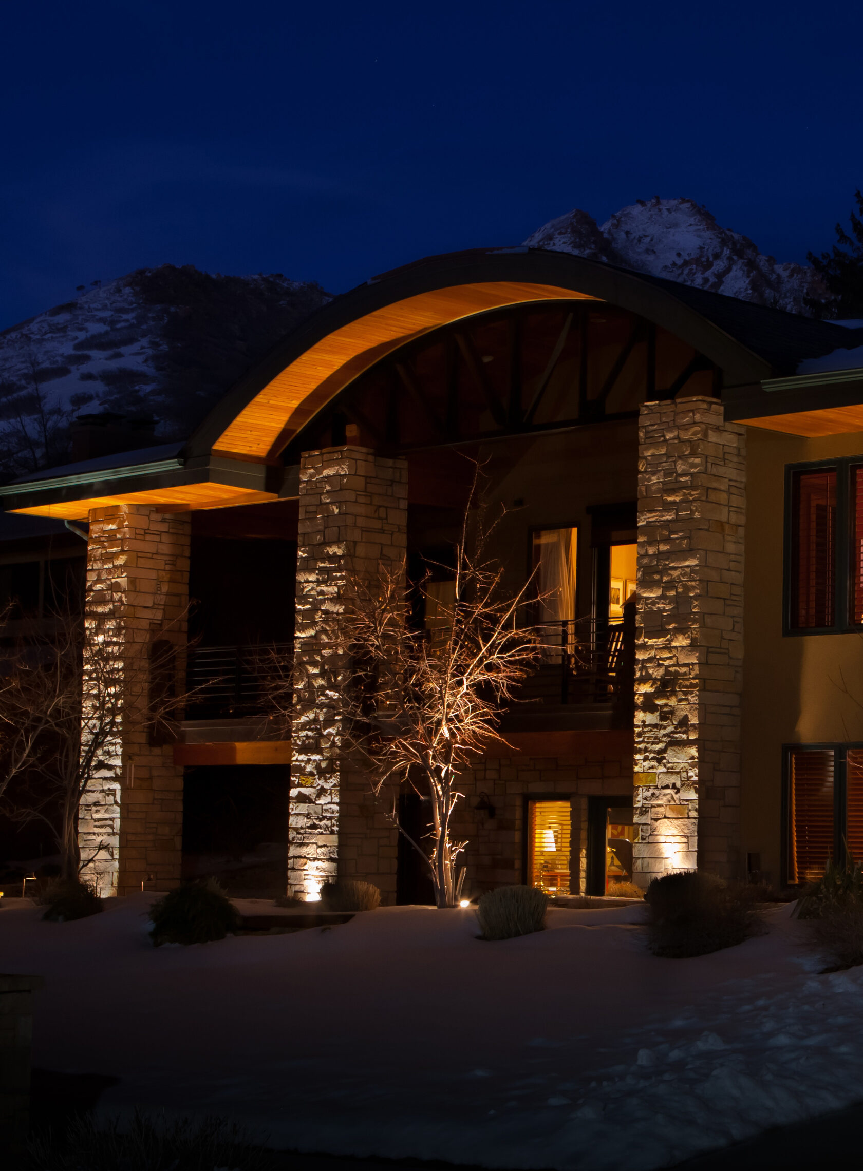 Заливка свода: Мягкая заливка внутренней поверхности свода теплым светом создает ощущение уюта и гостеприимства, манит пройти под аркой.