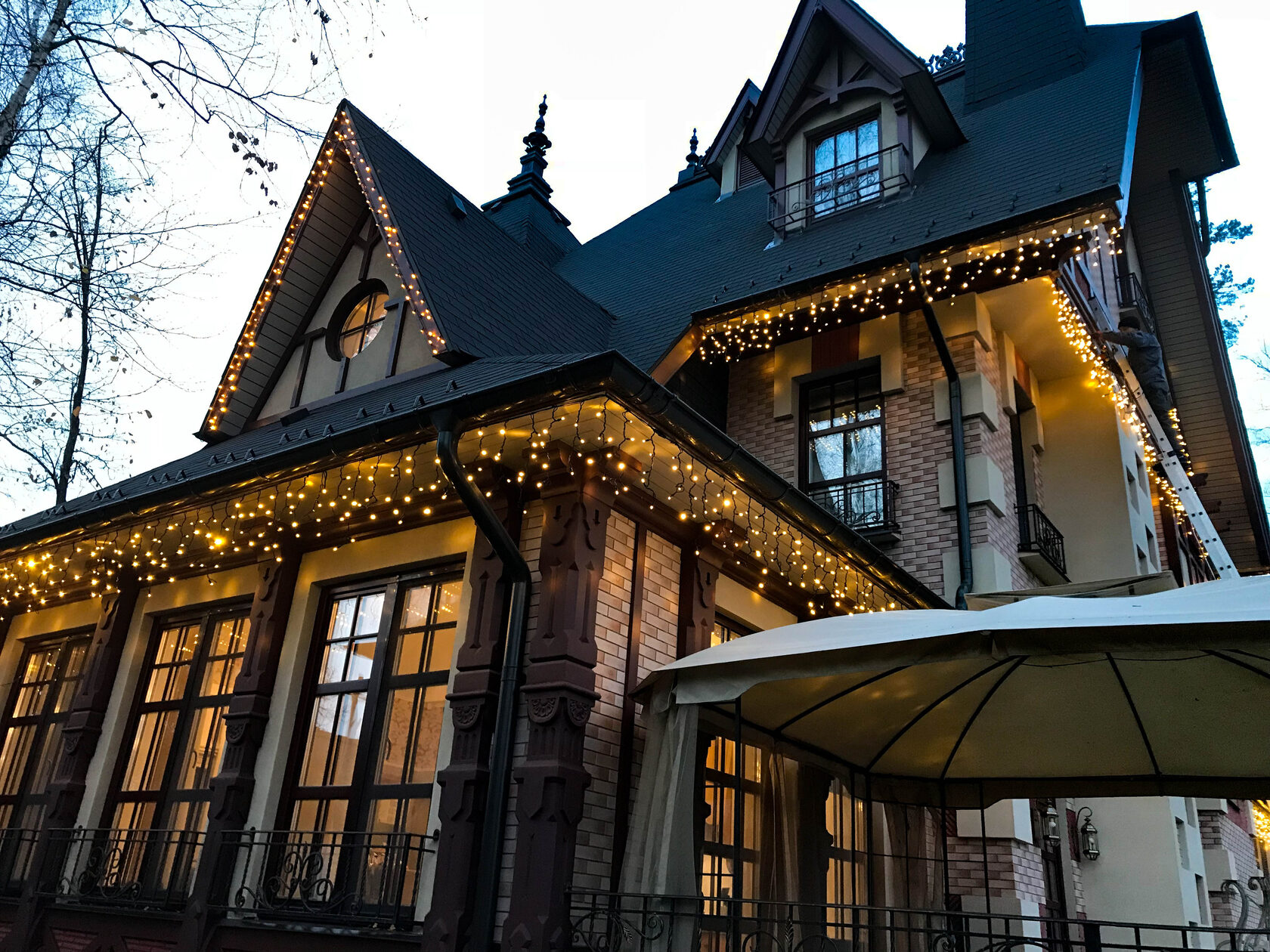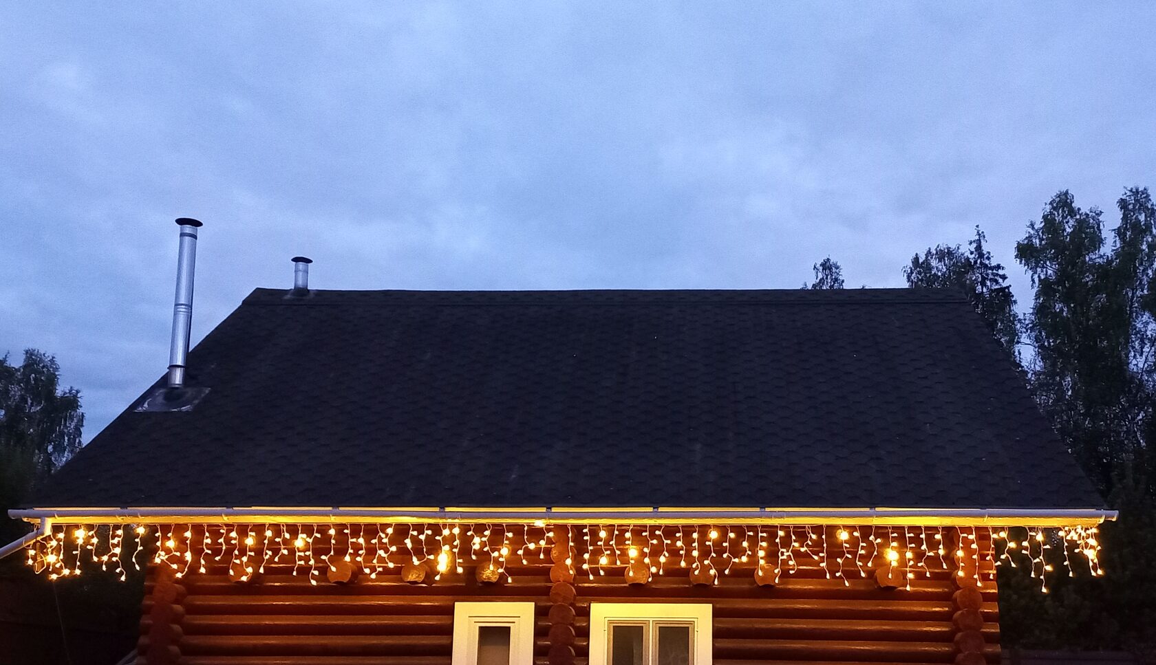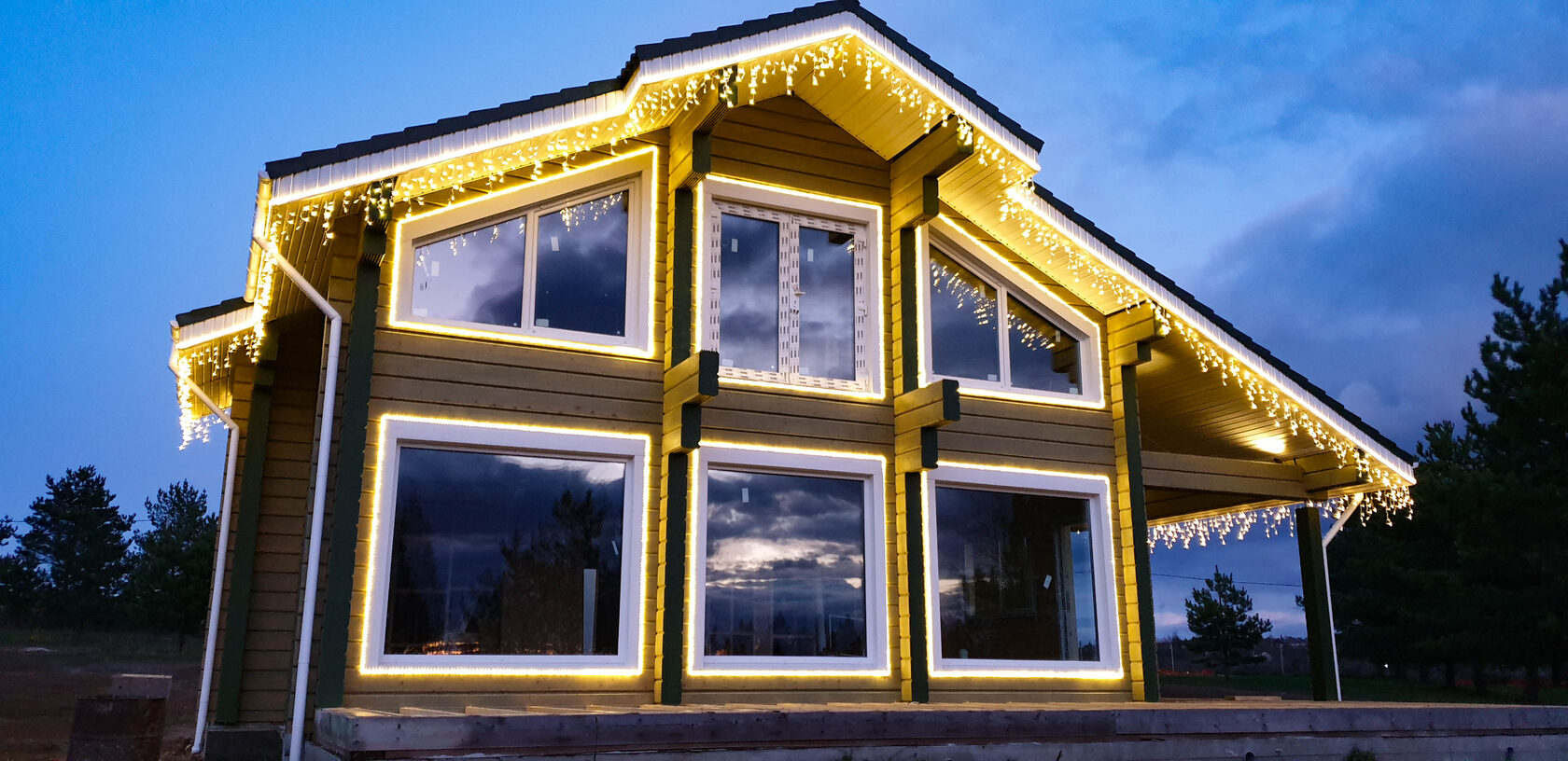 Самый популярный способ украшения фасада — крепление кабеля бахромы к подшивке крыши. Ночью проводов не видно, а множество диодов создают эффект широкого светового карниза, подчеркивая контуры здания и обеспечивая достаточное функциональное освещение. Чем светлее цвет фасада, тем больше света он отражает. Как правило, только бахромы достаточно для освещения небольшого дома, но в сочетании с архитектурными фонарями они дополняют друг друга, создавая интересную игру света и теней. Также бахрома хорошо комбинируется с контурной подсветкой из дюралайта или неона.