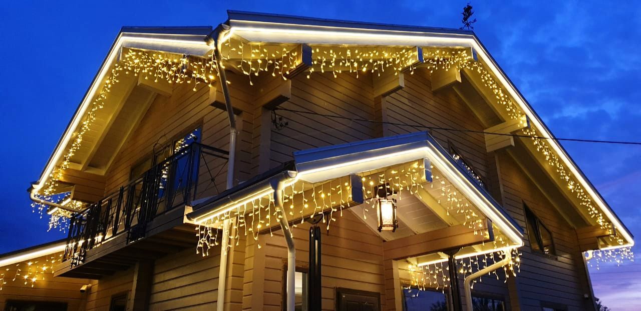 Эту гирлянду можно использовать для оформления козырьков крыш, контуров фасадов зданий, коттеджей, магазинов, ресторанов и кафе. Также бахрома популярна для подсветки перил балконов и террас, лестниц, арок. Ею оформляют и нежилые постройки на участке: бани, беседки, навесы, гаражи, мостики, перголы, заборы и другие объекты с прямыми контурами, на которые можно закрепить провод.