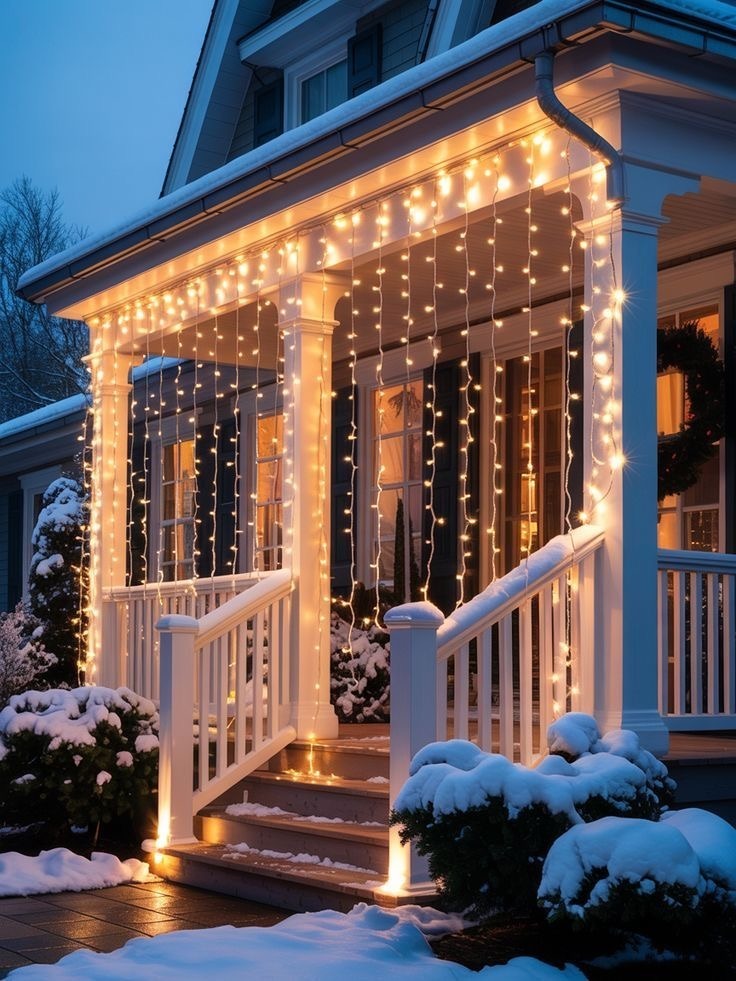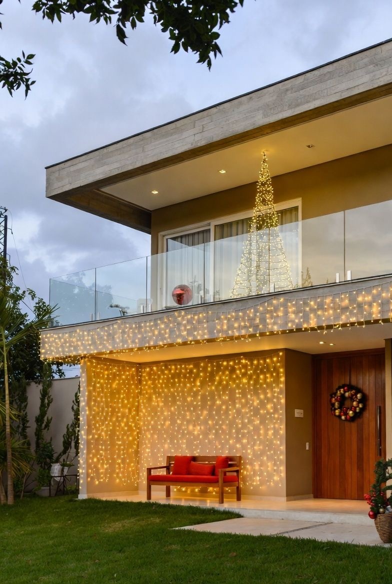 Преимущество такого подхода — лаконичность и элегантность. Дом не перегружен декором, но выглядит празднично и стильно. Это решение для тех, кто ценит сдержанность и хороший вкус. Используйте теплый или холодный белый свет в зависимости от стиля дома.
